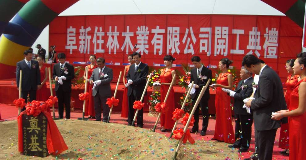 在一片热烈的掌声和鞭炮声中,姚志平、温建国、潘利国、韩景瑞、史广海、井上守等共同为阜新住林木业有限公司奠基。